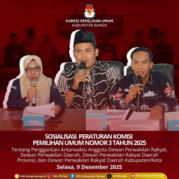 Kabupaten Bungo — Komisi Pemilihan Umum (KPU) Kabupaten Bungo menggelar Sosialisasi Peraturan KPU (PKPU) Nomor 3 Tahun 2025 tentang Pengganti Antarwaktu (PAW) Anggota DPR, DPD, DPRD Provinsi, dan DPRD Kabupaten/Kota, selasa, 9 Desember 2025, bertempat di Aula Kantor KPU Bungo pada pukul 14.30 WIB hingga selesai.