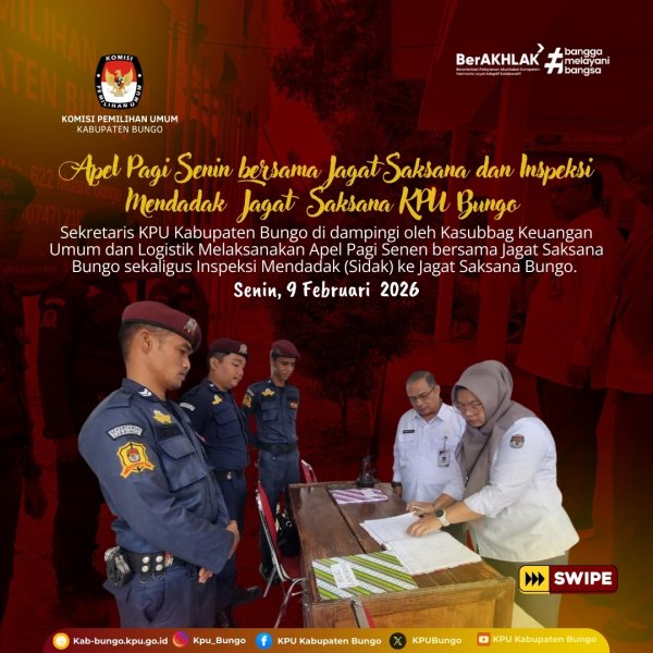 Usai pelaksanaan apel, Sekretaris KPU Kabupaten Bungo melanjutkan kegiatan dengan melakukan Sidak terhadap Jagat Saksana Bungo. Dalam Sidak tersebut dilakukan pengecekan langsung terhadap atribut dan kelengkapan personel, Buku Laporan Kegiatan, Buku Tamu, serta Buku Mutasi Jagat Saksana. Pemeriksaan ini bertujuan untuk memastikan bahwa seluruh administrasi dan perlengkapan pendukung tugas pengamanan tersedia dan dilaksanakan sesuai dengan ketentuan yang berlaku.