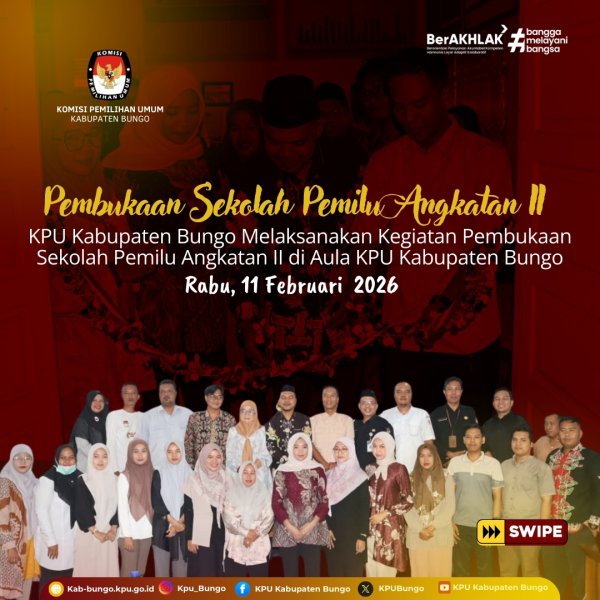 Komisi Pemilihan Umum Kabupaten Bungo secara resmi membuka kegiatan Sekolah Pemilu Angkatan Ke-2 pada Rabu, 11 Februari 2026, bertempat di Aula Kantor KPU Kabupaten Bungo. Kegiatan ini merupakan bagian dari komitmen KPU Kabupaten Bungo dalam meningkatkan pemahaman masyarakat terhadap kepemiluan serta memperkuat demokrasi di Kabupaten Bungo.