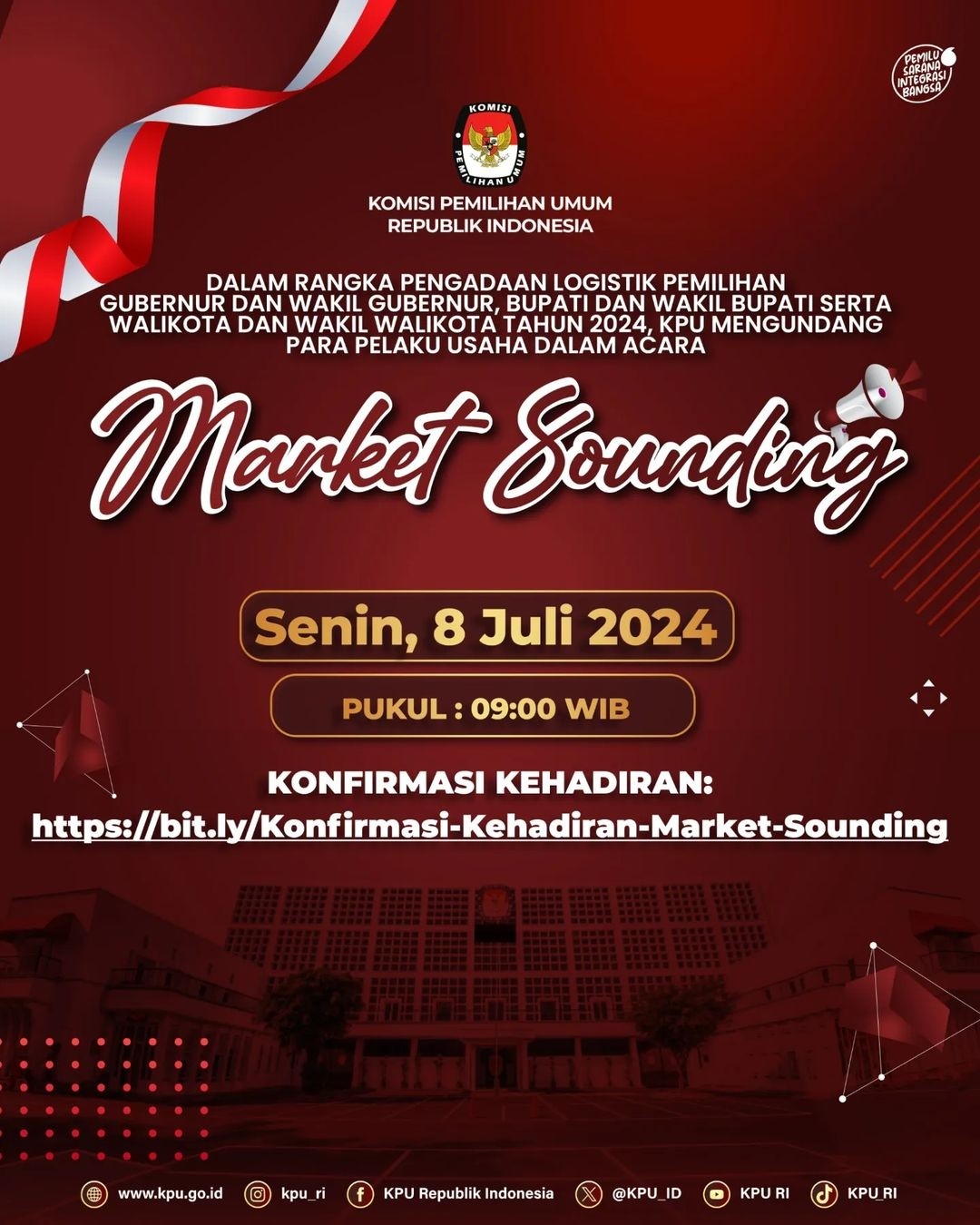 Pemberitahuan/Pengumuman Nomor 2334/PP.09.2-SD/06/2024 Tentang Pelaksanaan Kegiatan Market Sounding dalam rangka Pengadaan Logistik Pemilihan 2024 pada Rapat Koordinasi dan Bimbingan Teknis Persiapan Pengadaan Logistik Pemilihan Gubernur dan Wakil Gubernur, Bupati dan Wakil Bupati, serta Walikota dan Wakil Walikota tahun 2024, informasi selengkapnya DISINI
