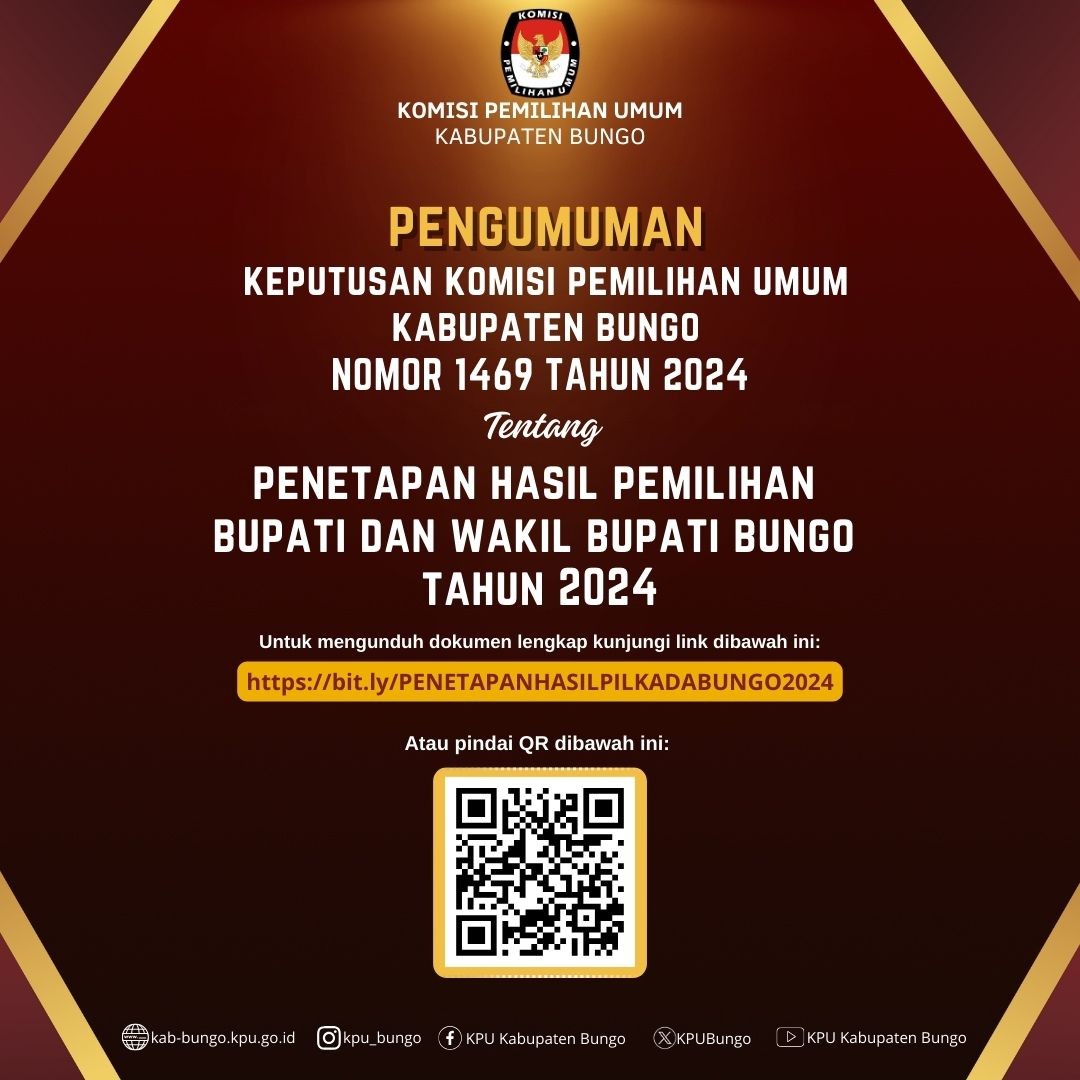 PENGUMUMAN KEPUTUSAN KPU KABUPATEN BUNGO TENTANG PENETAPAN HASIL PEMILIHAN BUPATI DAN WAKIL BUPATI BUNGO TAHUN 2024