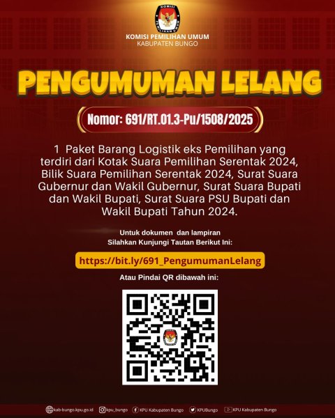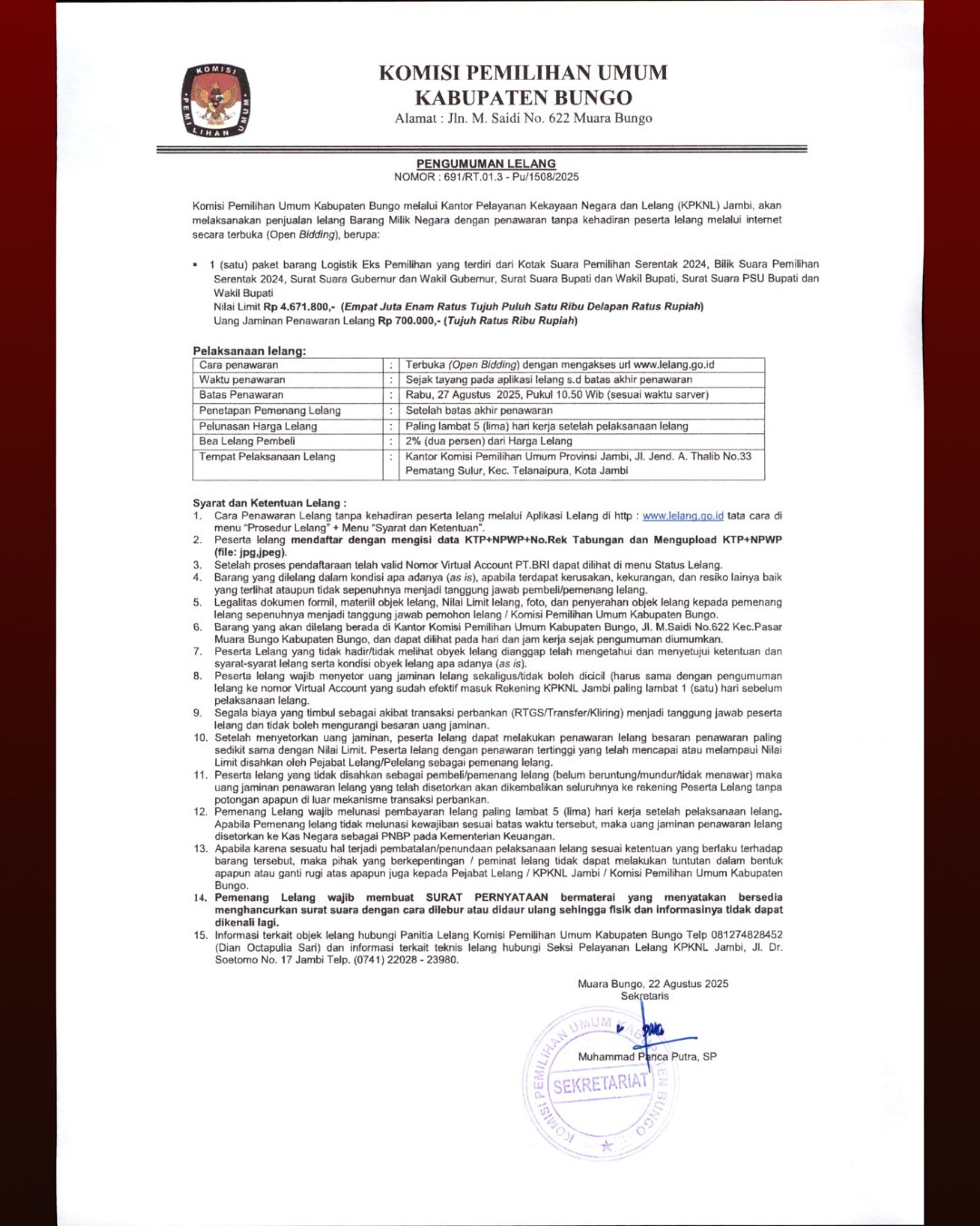 Hai #temanpemilih KPU Kabupaten Bungo melalui kantor Pelayanan Kekayaan Negara dan Lelang (KPKNL) Jambi, akan melaksanakan penjualan lelang 1 (satu) paket barang logistik eks Pemilihan yang terdiri dari Kotak Suara Pemilihan Serentak 2024, Bilik Suara Pemilihan Serentak 2024, Surat Suara Gubernur dan Wakil Gubernur, Surat Suara Bupati dan Wakil Bupati, Surat Suara PSU Bupati dan Wakil Bupati Tahun 2024. Dengan penawaran tanpa kehadiran peserta lelang melalui internet secara terbuka (open bidding). Yuk simak informasi lelangnya....
