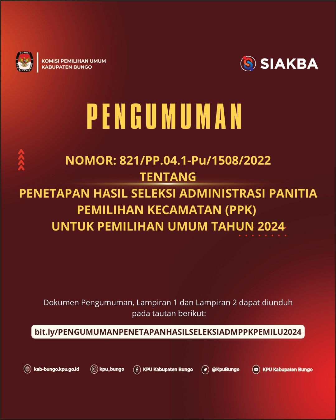 Dokumen Pengumuman, Lampiran 1 (nama-nama pendaftar yang lulus administrasi), Lampiran 2 (Pembagian Sesi Seleksi Tertulis Calon Anggota Panitia Pemilihan Kecamatan (PPK) di Ruang Labor SMP Negeri 1 Muara Bungo) dapat di unduh di tautan : http://bit.ly/PENGUMUMANPENETAPANHASILSELEKSIADMPPKPEMILU2024