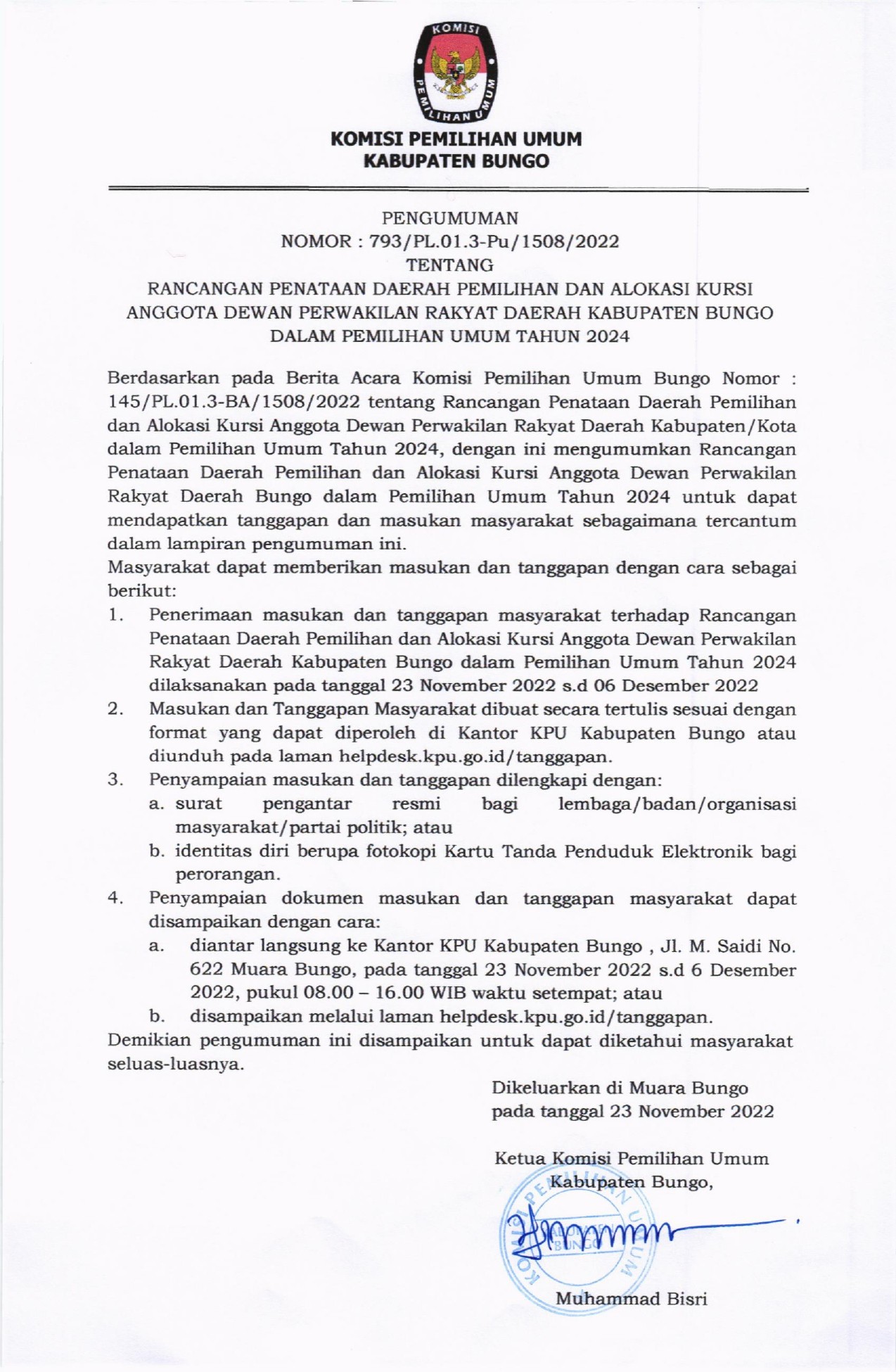 KPU Kabupaten Bungo menerima Tanggapan Masyarakat terhadap Rancangan Penataan Daerah Pemilihan dan Alokasi Kursi Anggota Dewan Perwakilan Rakyat Daerah Kabupaten Bungo dalam Pemilihan Umum Tahun 2024 dilaksanakan pada tanggal 23 November s.d 6 Desember 2022.