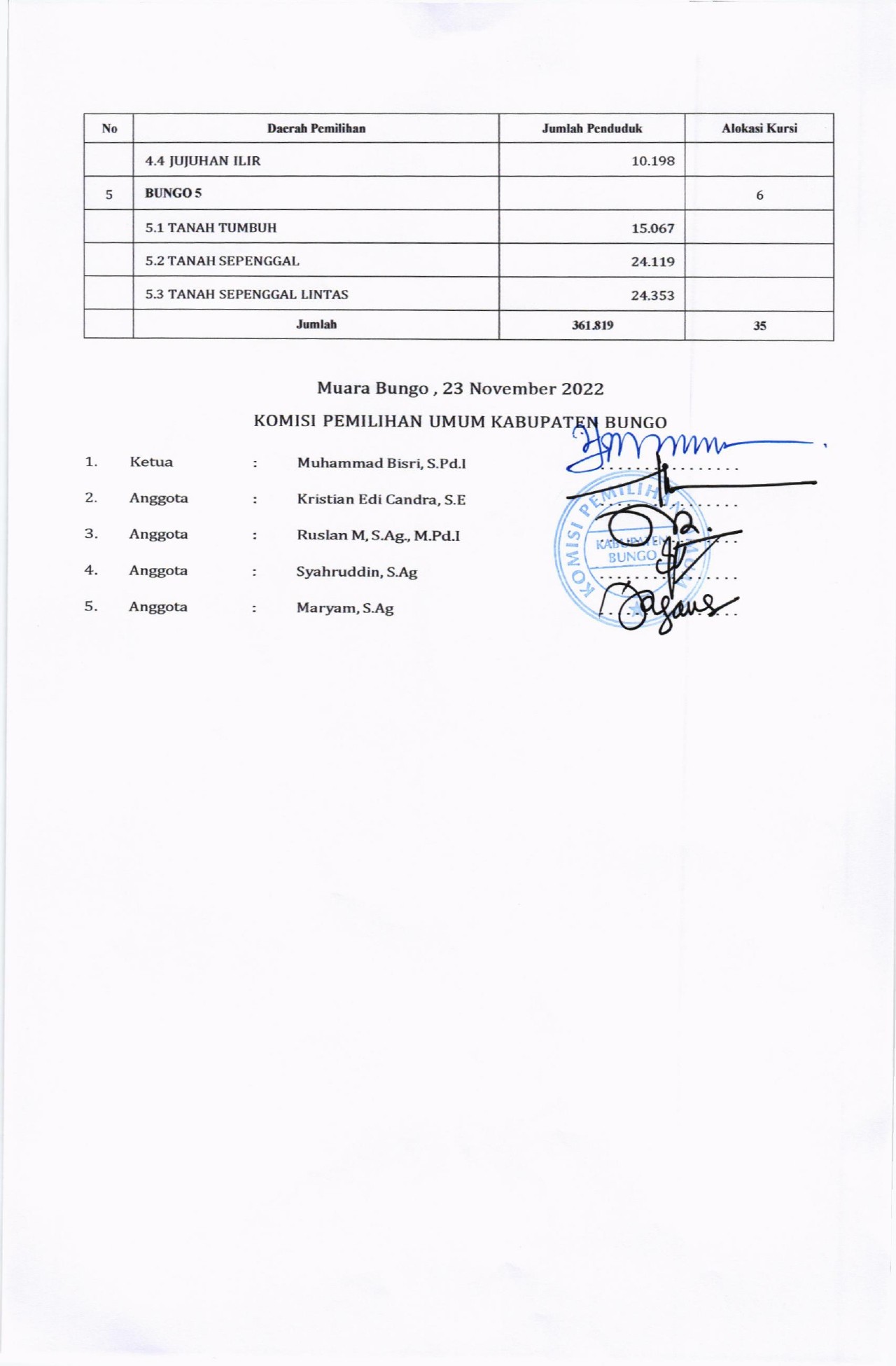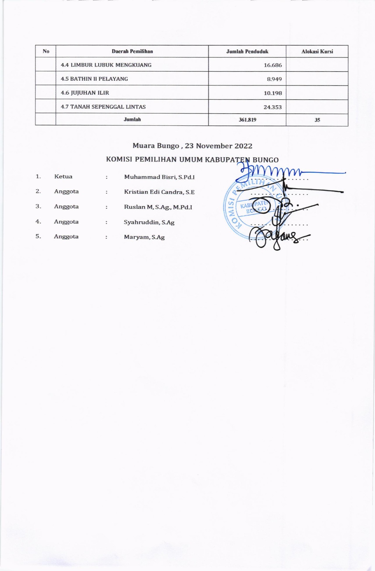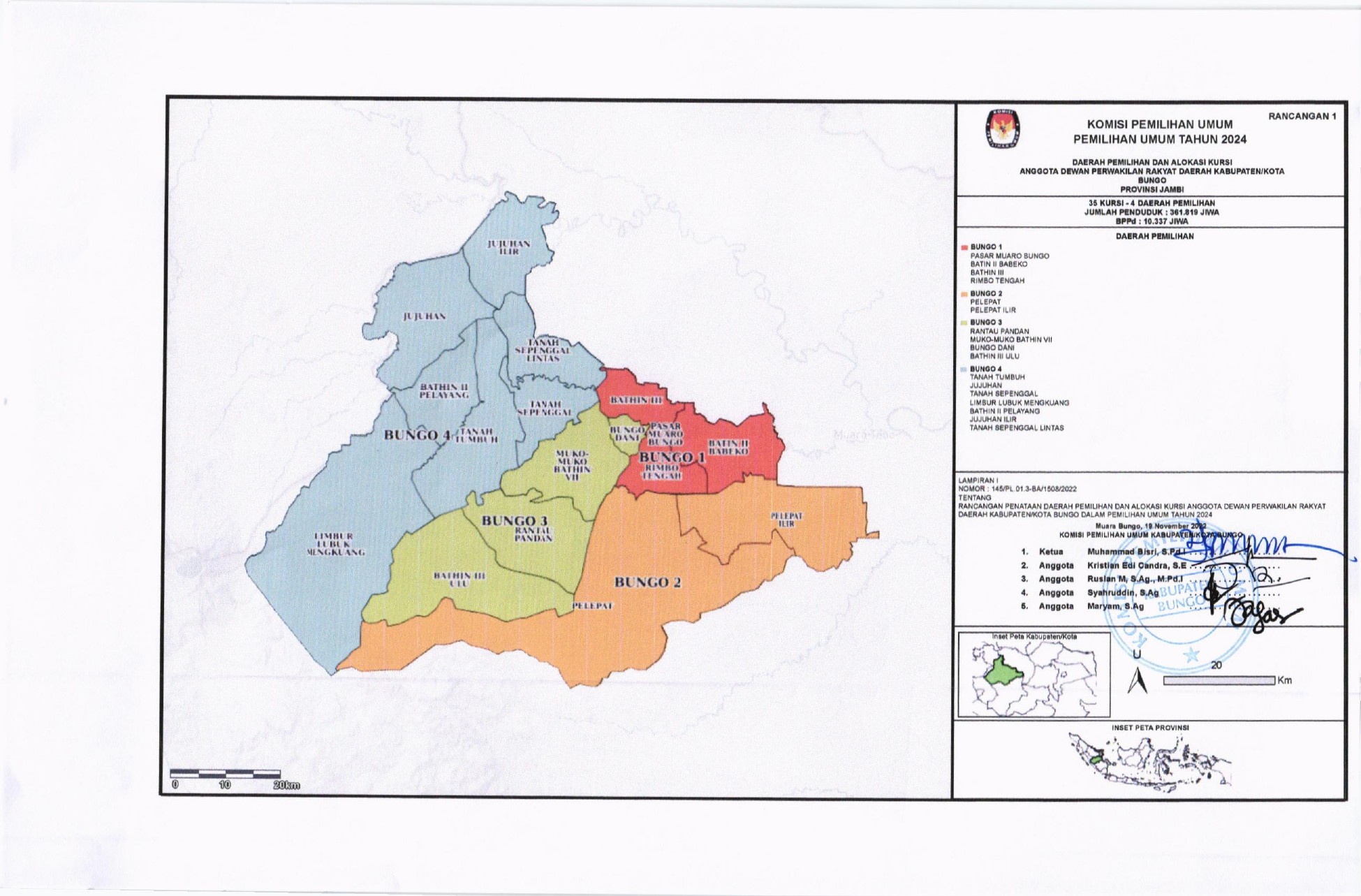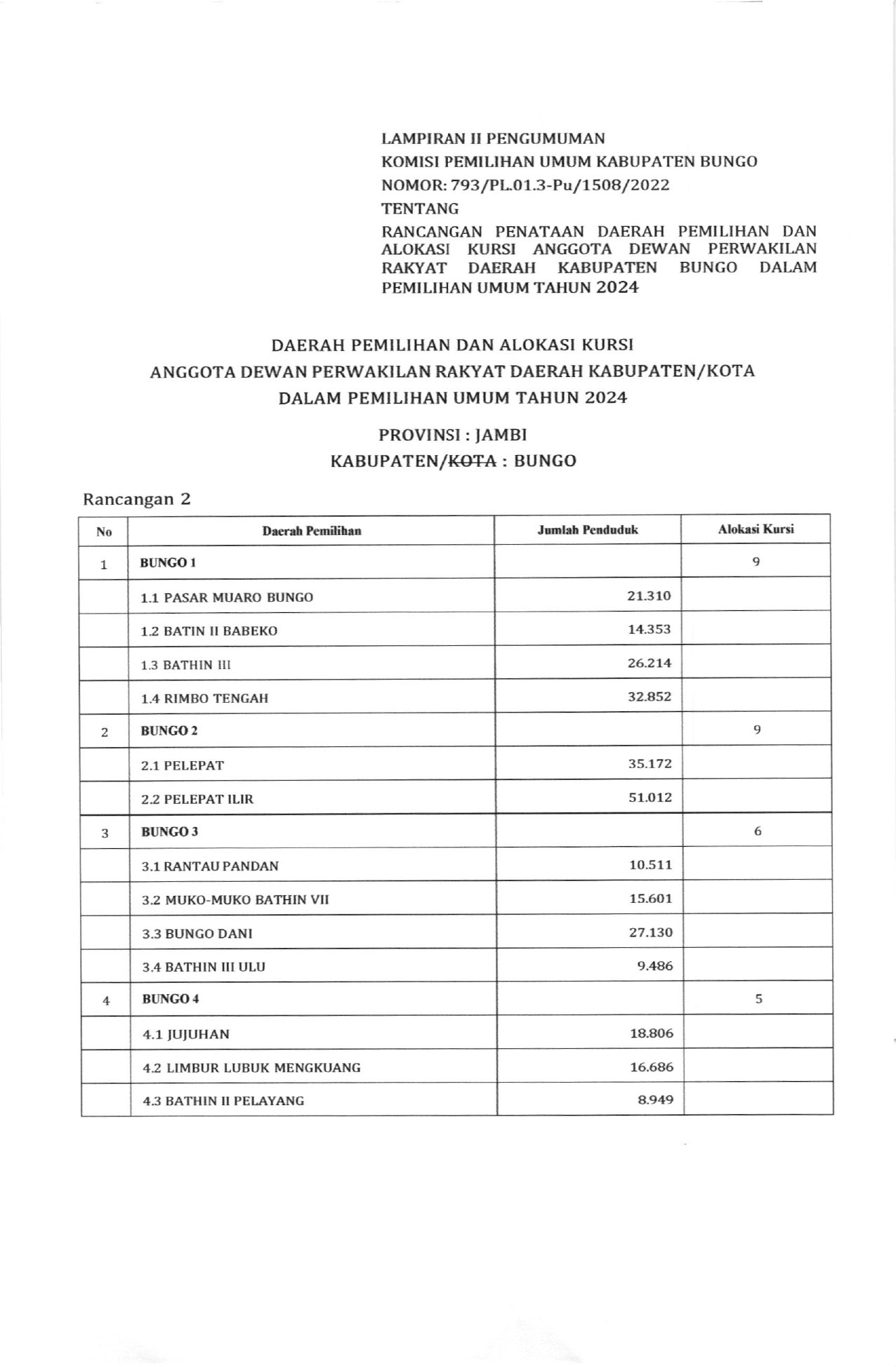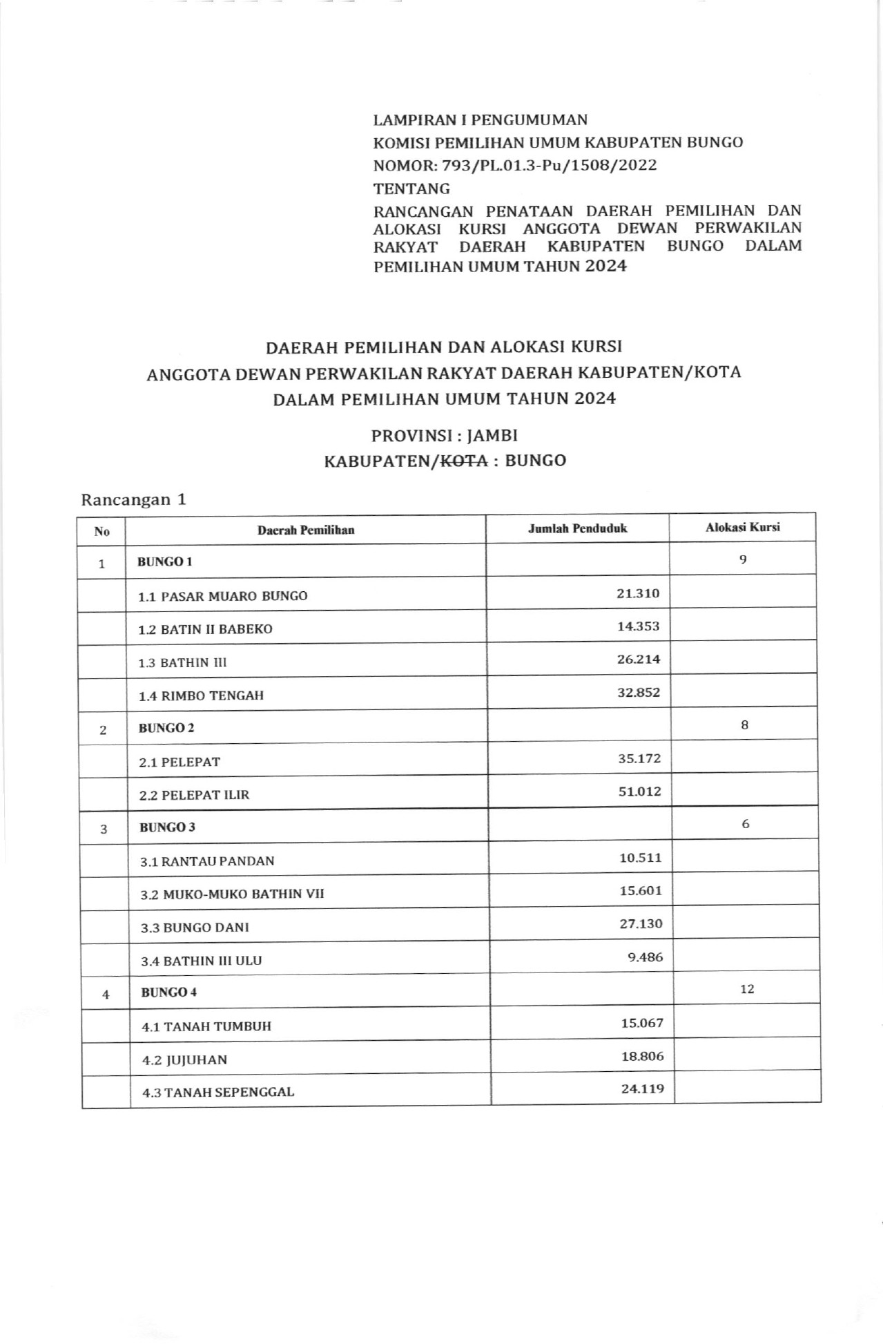 PENGUMUMAN RANCANGAN PENATAAN DAPIL DAN ALOKASI KURSI ANGGOTA DPRD KABUPATEN BUNGO DALAM PEMILU TAHUN 2024