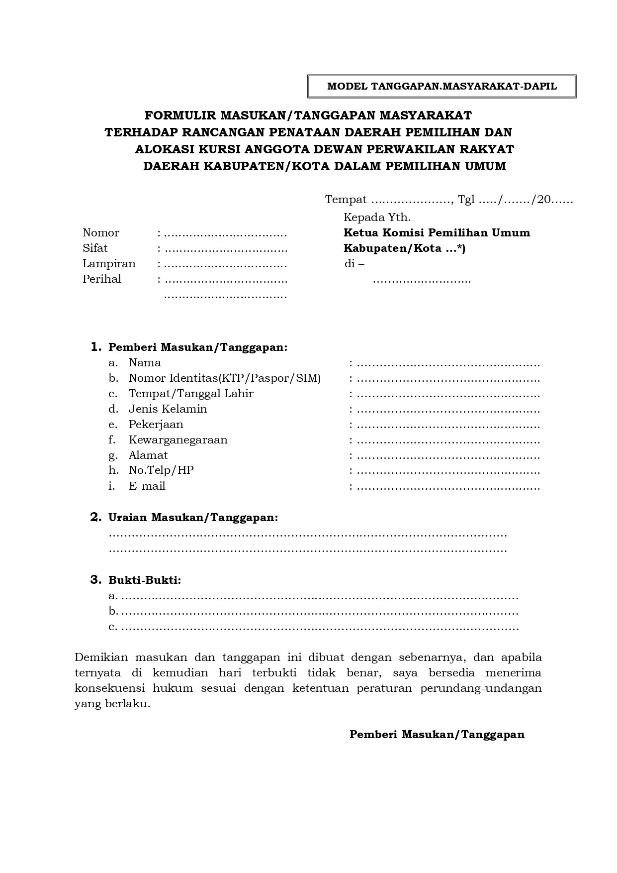 Masukan dan Tanggapan Masyarakat dapat dibuat secara tertulis sesuai dengan format yang dapat diperoleh di Kantor KPU Kabupaten Bungo / di unduh di sini dan masukan dan tanggapan langsung bisa dilakukan Laman helpdesk.kpu.go.id/tanggapan